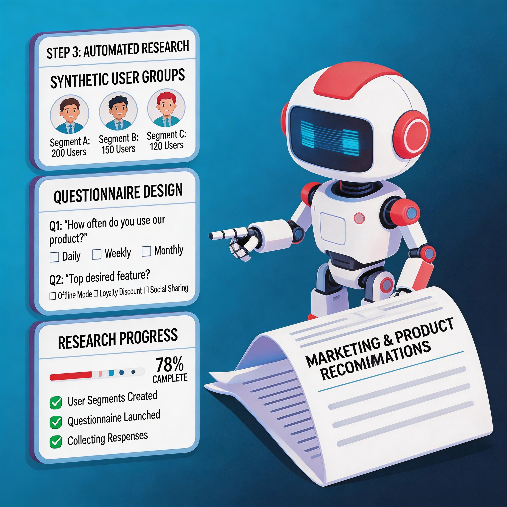 我们通过多轮采样与结果对比、严格的 Prompt 工程设计和质量检查机制保障一致性。同时建议将 SynthVoice 用于快速验证方向和假设筛选,重大决策可结合小样本真实调研进行校准。